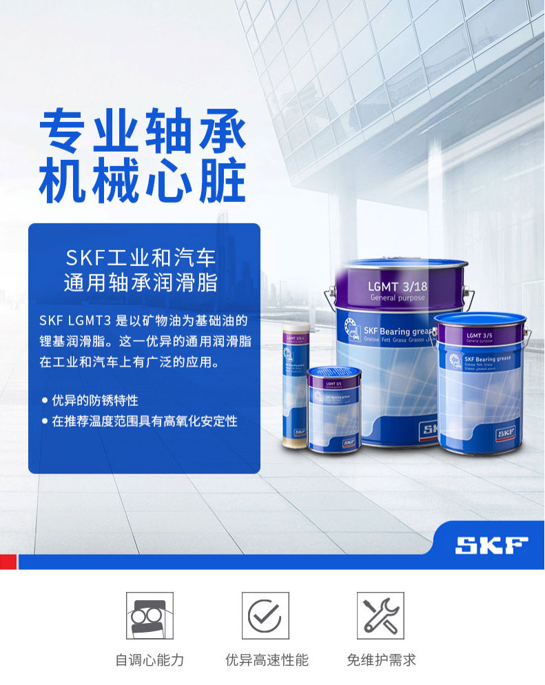 SKF工业和汽车通用轴承润滑脂 SKF LGMT3是以矿物油为基础油的锂基润滑脂。这一优异的通用润滑脂在工业和汽车上有广泛的应用。