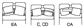 调心滚子轴承,如图所示,有高负荷容量设计的EA型,C型,CD型,CA型。设计上, EA型,C型,CD型 为冲压保持架, CA型为铜合金车制保持架。EA 型轴承具有高负荷容量,低转矩的特长。